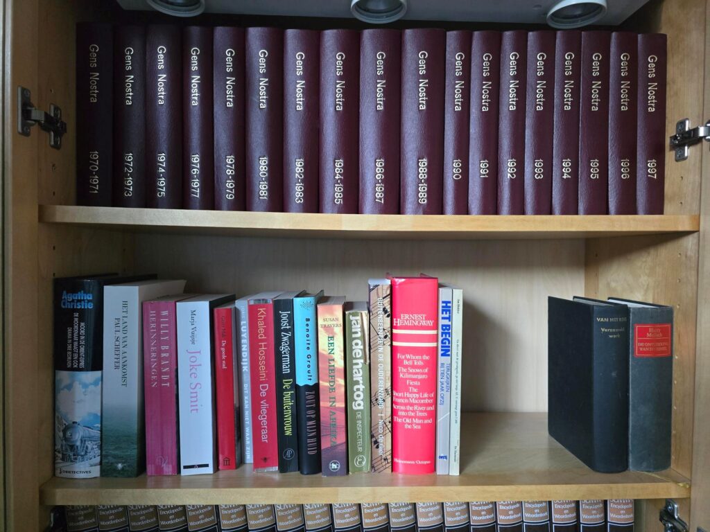In de kast staan 18 gebonden boeken van Gens Nostra. Het betreft de jaargangen 1970-1971, 1972-1973, 1974-1975, 1976-1977, 1978-1979, 1980-1981, 1982-1983, 1984-1985, 1986-1987, 1988-1989, 1990, 1991, 1992, 1993, 1994, 1995, 1996, 1997.